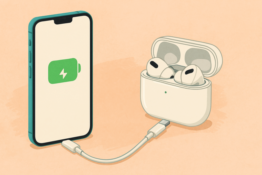 iPhone 15シリーズ以降ではUSB-Cポートを搭載しており、AirPods Pro(第2世代USB-Cモデル)とUSB-Cケーブルで接続することで、なんとiPhoneからAirPodsへ給電することができます。