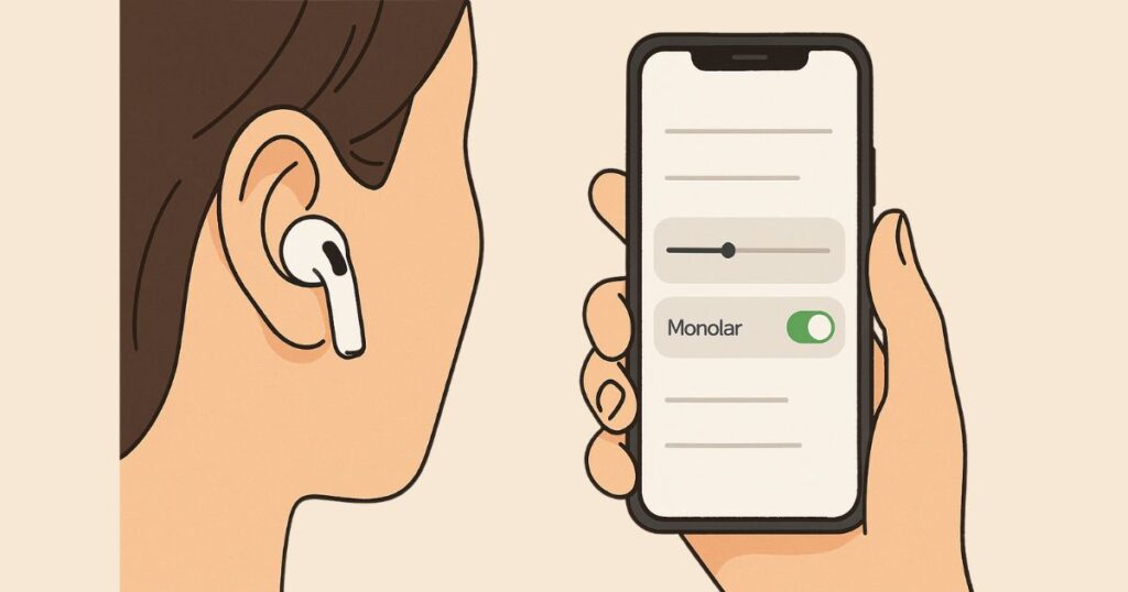 通常のステレオ音声は左右のチャンネルに音が分かれていますが、設定で”モノラルオーディオ”に切り替えることで、左右の音を1つにまとめて片方のイヤホンでもすべての音が聞こえるようになります。
