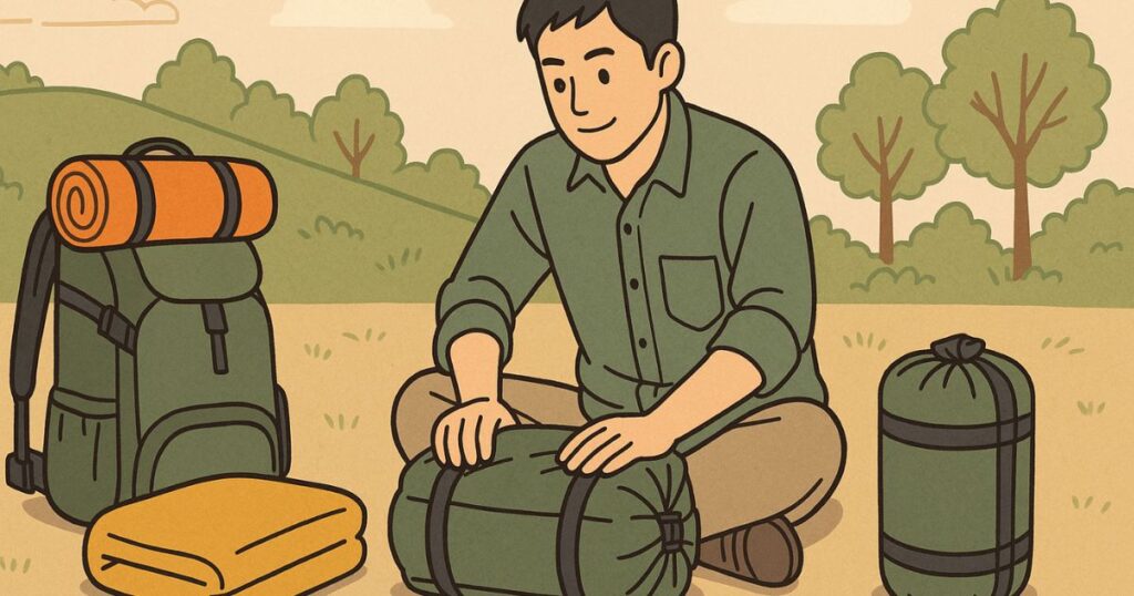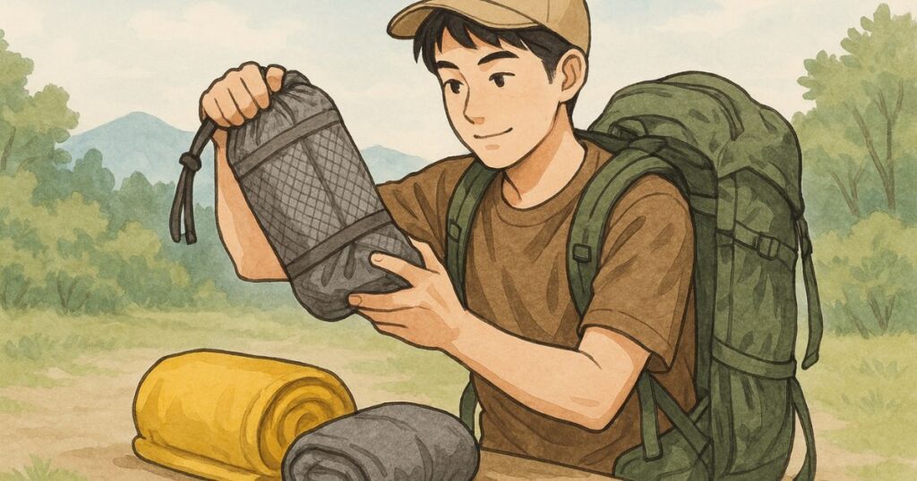 まず、圧縮バッグやスタッフサックを活用して衣類や寝具を小さくまとめるのが基本。