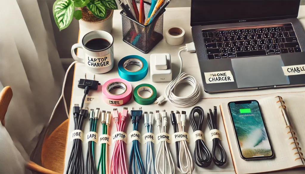 - コードを識別しやすくする:充電ケーブルやUSBコードなど、見た目が似ているものは、マスキングテープにデバイス名を書いて貼ることで、一目で識別できます。