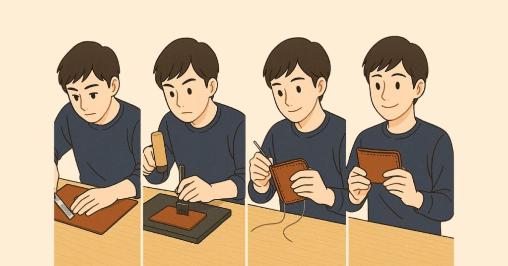 レザークラフトの工程は「裁断 → 接着 → 穴あけ → 縫製 → コバ仕上げ」というシンプルな流れで進みます。