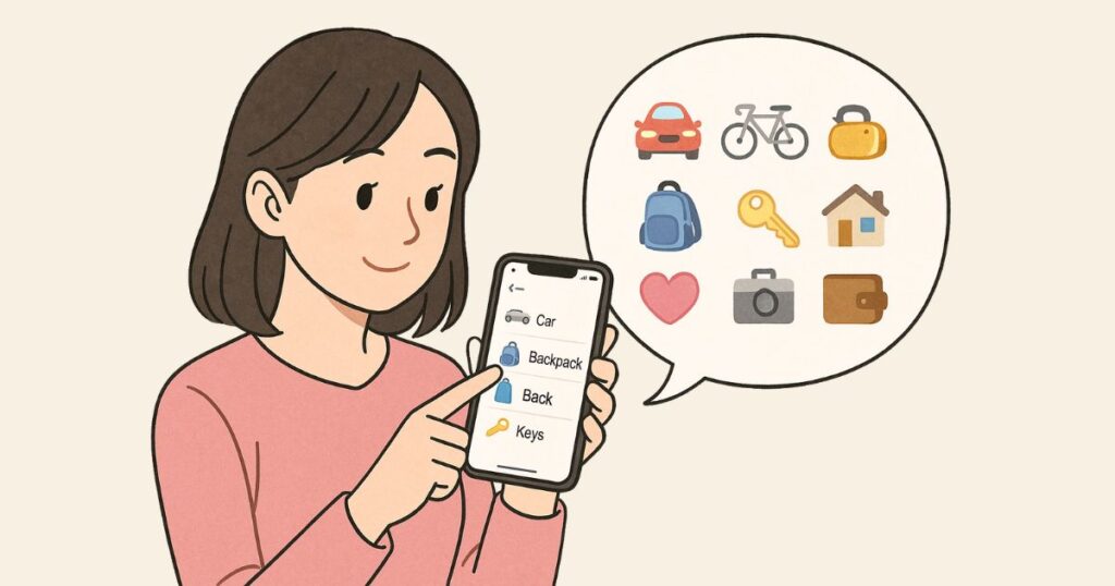 例えば、仕事用のバッグには「🎒通勤バッグ」、家の鍵には「🔑玄関キー」、ペットの首輪に付けたAirTagには「🐶ココのタグ」といったように、直感的にわかる名前や絵文字を付けておけば、視認性と操作性が大きく向上します。