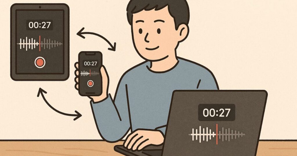 たとえば、通勤中にiPhoneで録音した内容を、帰宅後にMacの大画面でじっくり編集したり、iPadで文字起こしアプリと並べて作業したりと、シーンに応じて使い分けられるのが大きなメリットです。